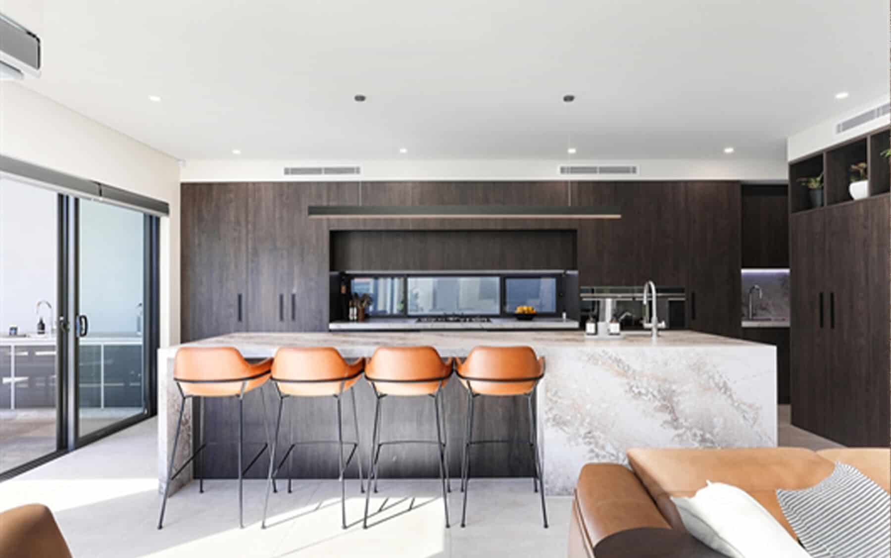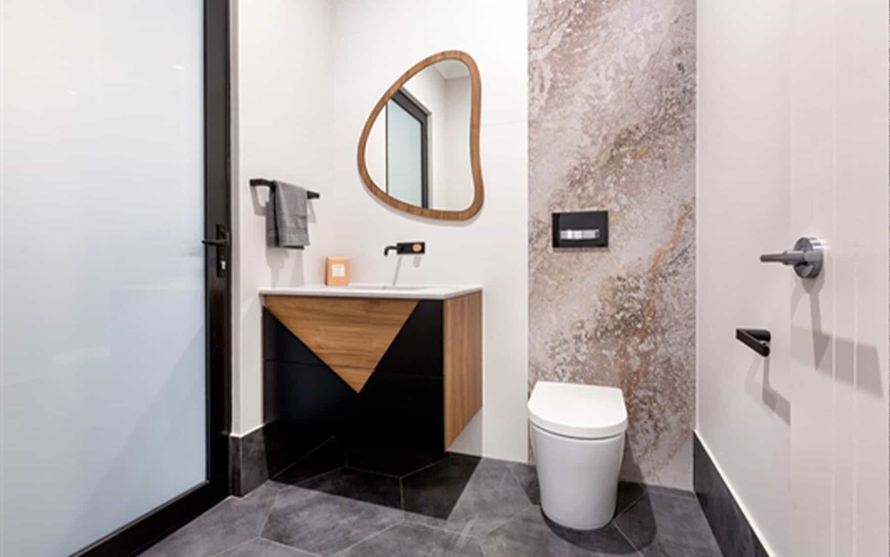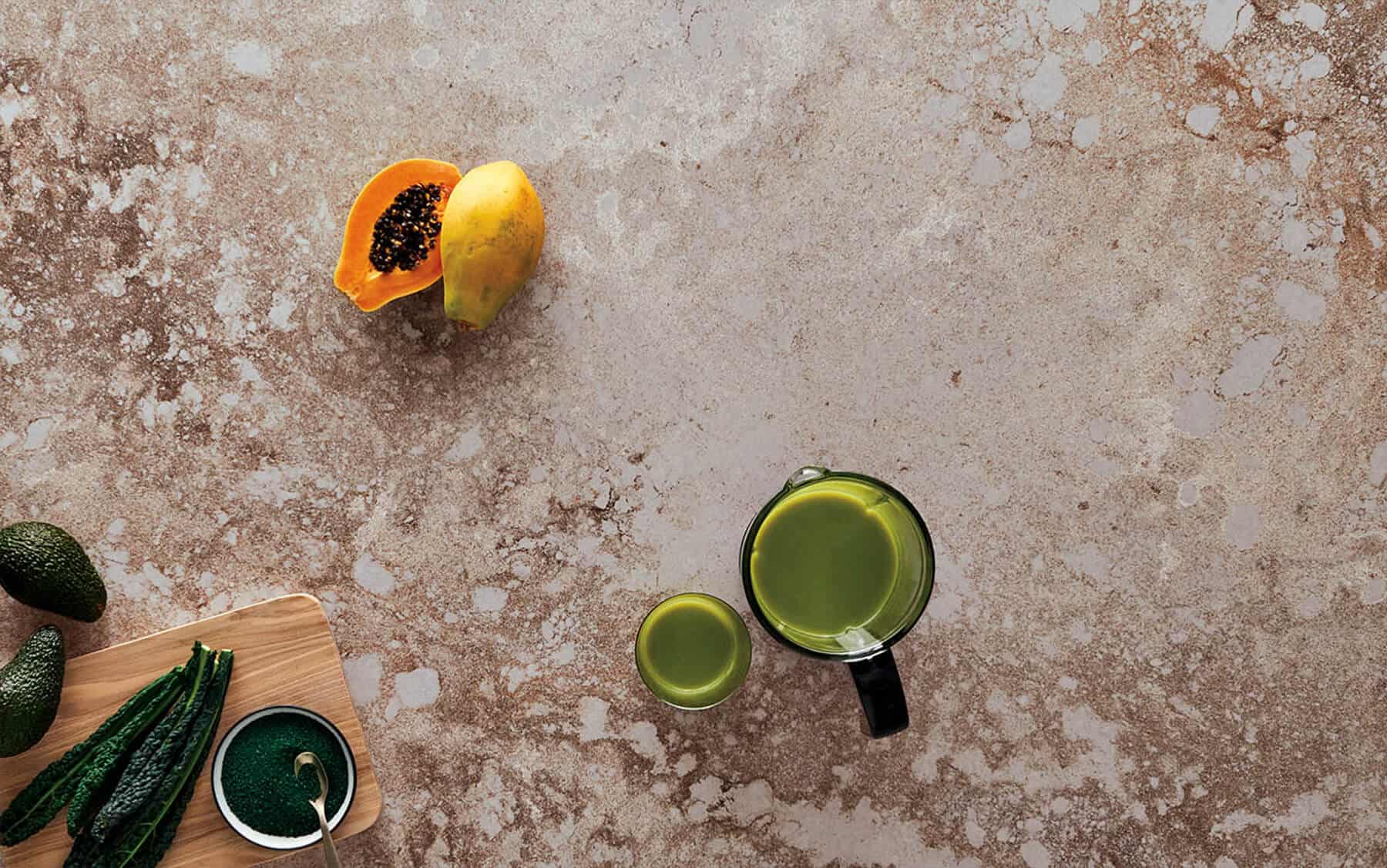 The industrial movement in contemporary interiors has led to a more robust design vocabulary. Tarnished metal, untreated wood and raw concrete are just some of the urban surfaces now penetrating the industry. Pairing well with a concrete floor, it can become sophisticated when softened by taupe tones or oak parquet. Mirrored or chrome fittings will serve as a trend-savvy accent, contrasting with the benchtop’s roughness.