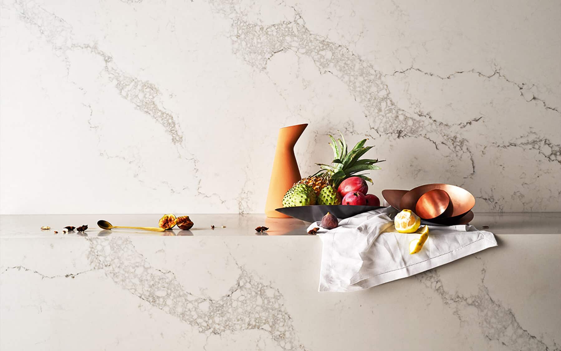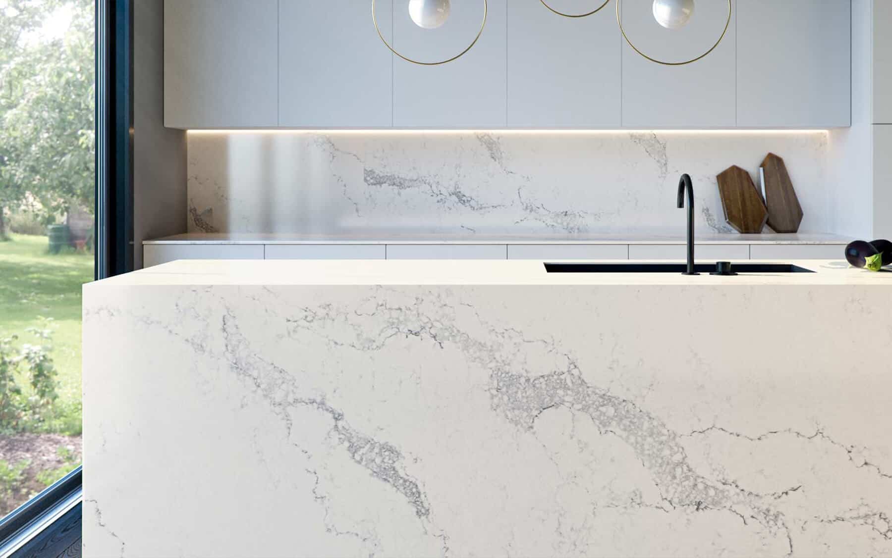 Caesarstone’s new Statuario Maximus™ marble inspired design features broad warm grey veins sweeping across its soft white base colour, further enriched by delicate background veins.